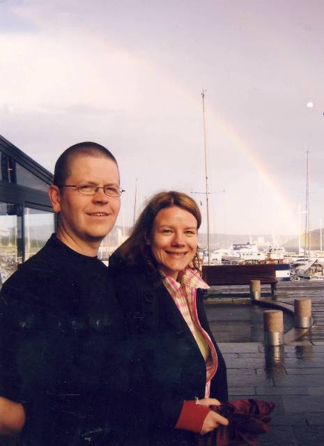 Min mann og meg selv med kjærlighetsvotten vi fikk av Halvard sin tante!:)