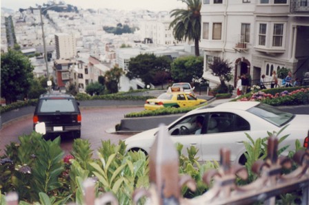 Lombard Street i San Fransico!:) Denne gangen gikk det galt for denne taxien. Den kjørte rett i en murvegg ved blomsterbedet!:)