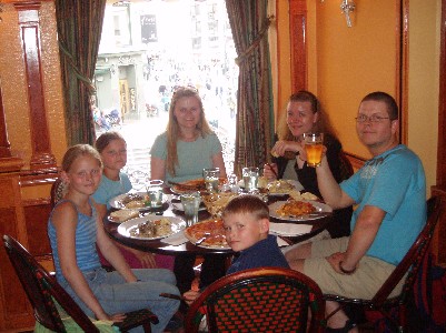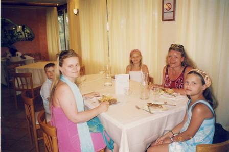 09.07.2006 var Halvard og jeg på hotellet hvor venninnen min, mannen hennes og ungene deres bodde!:) Halvard og mannen til min venninne ville se finalen i VM i fotball!:) Her er min venninne, ungene hennes og jeg og spiser middag på restauranten på hotellet hvor de bodde!:)