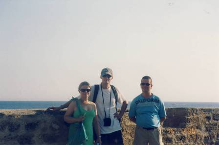 Min venninne, hennes mann og Halvard i gamlebyen i Alghero med utsikten mot sjøen i bakgrunnen!:)