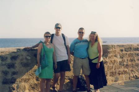 Min venninne, hennes mann, Halvard og meg i gamlebyen i Alghero med utsikten mot sjøen i bakgrunnen!:)