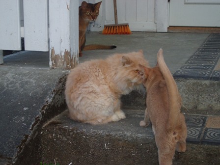 Abyssinerhunnkatten Fawn og perseren til Anne Marit dypt konsentrerte om en mus som Fawn hadde fanget!