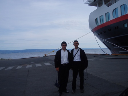 Min mann og jeg var vertskap for to unge gutter fra Coro De Iddanoa De Monteleone som bodde hos oss under sitt opphold i Trondheim. Her er Giuseppe og Giovanni på kaia før hurtigruteavgang.