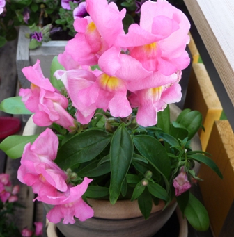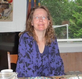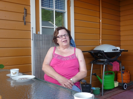 Anne Grethe som er med i katteklubben sammen meg slapper av på verandaen sin.