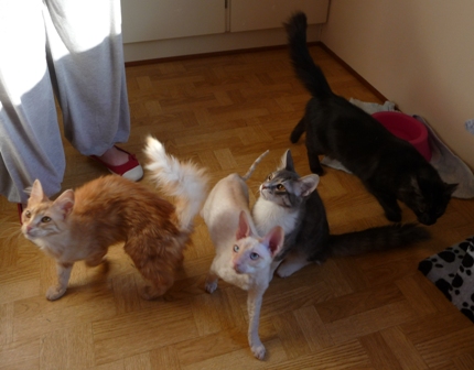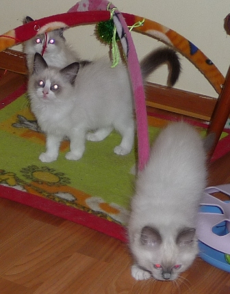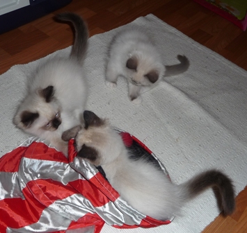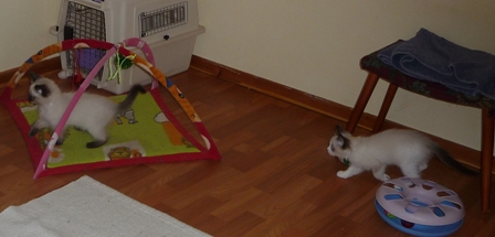 Noen av ragdollkattungene til Anne Grethe i ivrig lek på kattungerommet.