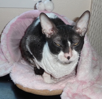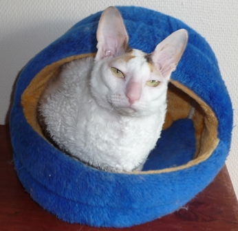 Cornish Rex hunnkatten (kastrat) til Silje slapper av i kattesengen sin!:)