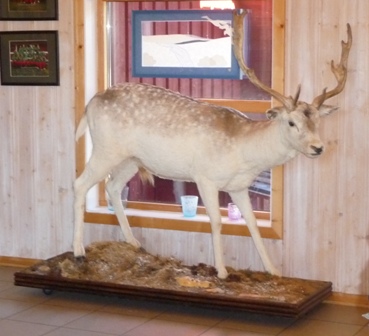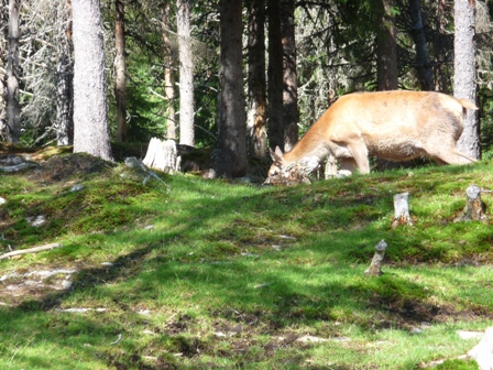 Den ene hjorten i Namskogan Familiepark spiser gress.