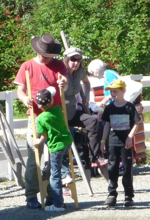 Halvard sin bror, min svigerinne og tvillingguttene deres prøver ut styltene inne i Namskogan Familiepark.