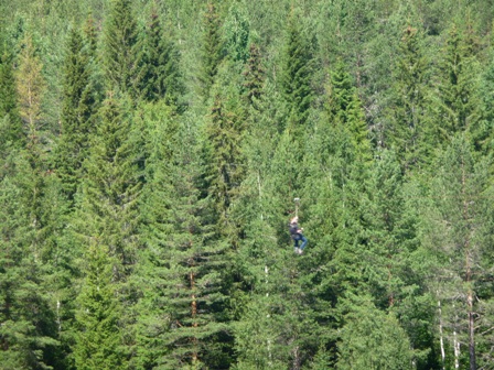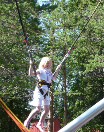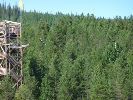 Oppe i Tøffingtårnet fikk den som ville på seg sikkerhetsutstyr, og de fikk fart slik at de gled etter en wire over vannet. Her ser dere en som nettopp har hoppet ut fra Tøffingtårnet.