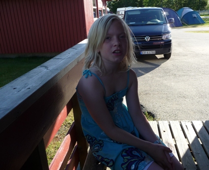 Datteren til venneparet vårt slapper av på verandaen på campinghytta hvor de bodde.
