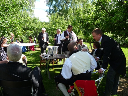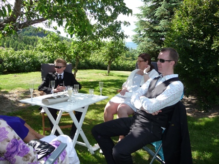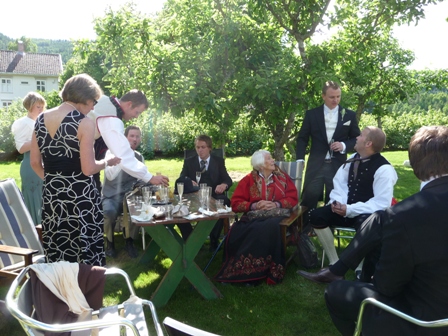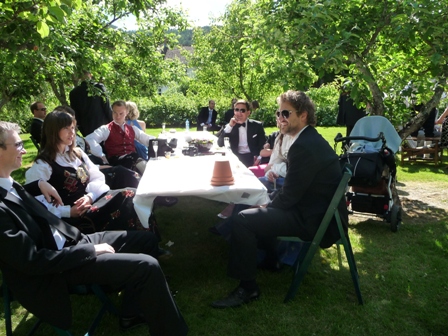 Bryllupsgjestene koser seg i hagen før bryllupsmiddagen!:)