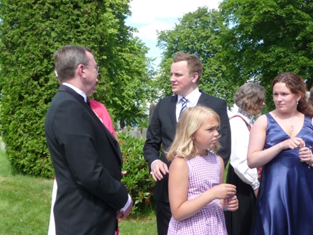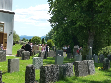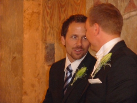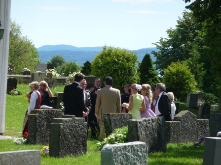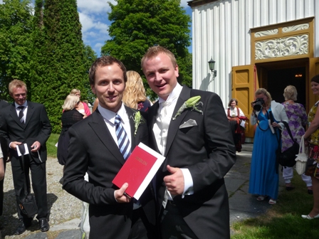 Min nevø (brudgommen) og kameraten hans utenfor Nes Kyrkje etter vielsen. Kameraten hans har det nye lesestoffet til min nevø i hånden!:)