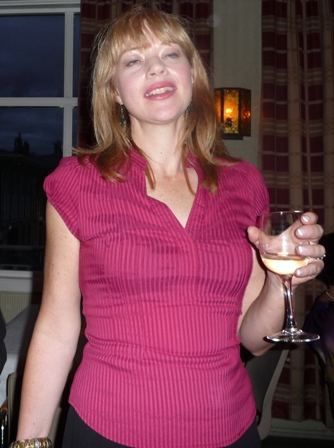 Venninnen min i sprudlende humør på utdrikkingslaget til en felles syforeningsvenninne